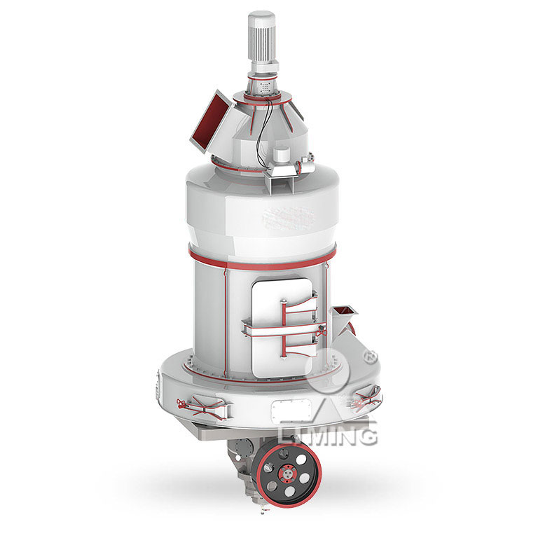 物料通過給料裝置被均勻地送至主機磨腔,在離心力和鏟刀作用下,物料在磨輥和磨環(huán)之間受到擠壓、研磨而被粉碎,粉碎后的物料在風力的作用下吹向選粉機進行分選,分選后的合格物料經(jīng)管道進入旋風集粉器收集,未達到細度要求的物料重新回到主機再次研磨。