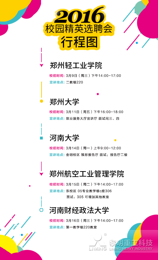 在接下來的一段時間內,黎明重工HR團隊將相繼走進鄭州輕工業學院、鄭州大學、河南大學、鄭州航空工業管理學院及河南財經政法大學等知名學府展開2016校園招聘宣講會,歡迎大家參加。屆時您將可以近距離與我們的HR交流更多詳細信息。